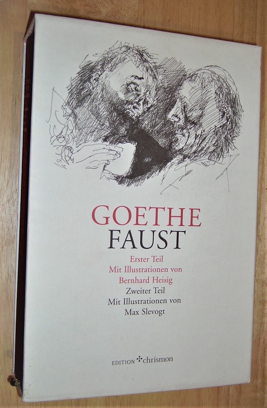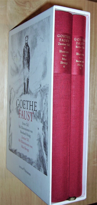 Goethe, Johann Wolfgang von. Faust. Erster + zweiter Teil im Schuber. 1: Der Tragödie erster Teil / mit Ill. von Bernhard Heisig. 2: Der Tragödie zweiter Teil / mit Ill. von Max Slevogt. 2 Bände. Hamburg: Hansisches Dr.– und Verl.-Haus, 2002. 25 cm, 213 / 337 S. Ill. Ln. im originalen Pp-Schuber. Als Mängelexemplar gekennzeichnet. Leichte Gebrauchsspuren. Schuber etw. angeschmutzt.