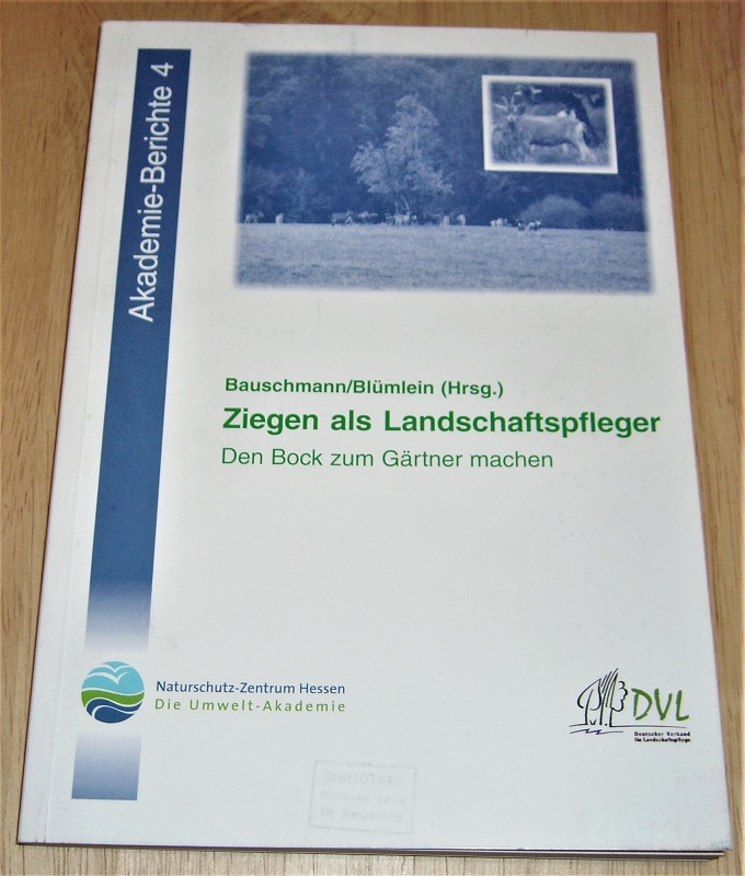 Bauschmann, Gerd u. Bernd Blümlein (Hrsg.): Ziegen als Landschaftspfleger. den Bock zum Gärtner machen. Wetzlar: NZH-Verl., 2004. 22 cm. 141 S. Ill., graph. Darst., Kt. Kart. Leichte Gebrauchsspuren. Kl. Stempel a. Umschlag + Titel. Akademie-Berichte / Naturschutz-Zentrum Hessen, 4. Aus der aufgelösten Bibliothek des Offenbacher Vereins für Naturkunde.