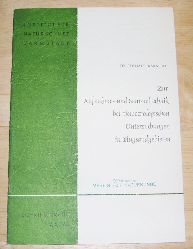 Karafiat, Helmut: Zur Aufnahme- und Sammeltechnik bei tiersoziologischen Untersuchungen in Flugsandgebieten. Darmstadt: Institut f. Naturschutz, 1960. 8. S. 57 – 80 mit 11 Abb. Geheftet. Leichte Gebrauchsspuren. Stempel a. Umschlag + Titel. Schriftenreihe / Institut für Naturschutz, Darmstadt, 5,3. Aus der aufgelösten Bibliothek des Offenbacher Vereins für Naturkunde.