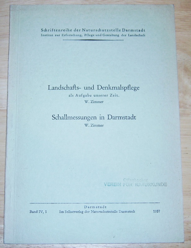 Zimmer, Werner: Landschafts- und Denkmalspflege als Aufgabe unserer Zeit / Schallmessungen in Darmstadt. Darmstadt: Naturschutzstelle, 1957. 8. 16 S. mit Abb. Kart. Leichte Gebrauchsspuren. Oberer Schnitt braunfleckig, Stempel a. Umschlag + Titel. Schriftenreihe der Naturschutzstelle Darmstadt, Bd. 4,1. Aus der aufgelösten Bibliothek des Offenbacher Vereins für Naturkunde.
