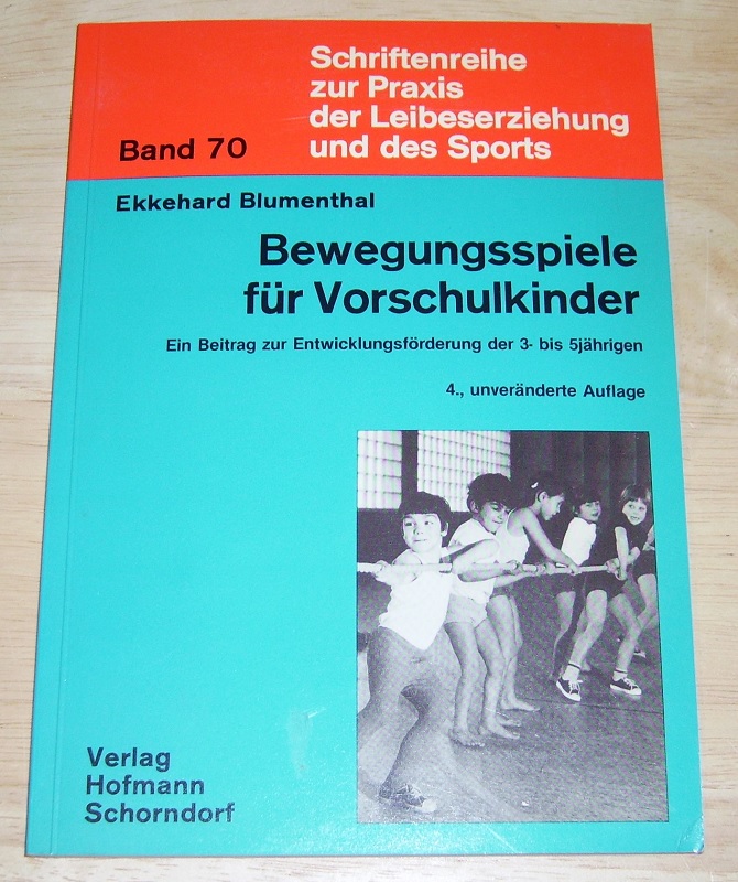 Blumenthal, Ekkehard: Bewegungsspiele für Vorschulkinder. Ein Beitrag zur Entwicklungsförderung der 3- bis 5jährigen. 4., unveränd. Aufl. Schorndorf: Hofmann, 1981. 21 cm. 105 S. Ill., Noten. Kart. Schnitt etw. fleckig, sonst leichte Gebrauchsspuren. Schriftenreihe zur Praxis der Leibeserziehung und des Sports, Bd. 70.