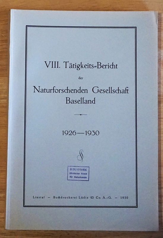 Tätigkeitsberichte der Naturforschenden Gesellschaft Baselland Band VIII. Berichtsjahre 1926-1930. Enthält u.a.: Heinis,Fritz: Der Bölchen und seine Pflanzenwelt / Leuthardt, Franz: Beiträge zur Lepidopterenfauna / Leuthardt, Franz: Der Boden von Liestal. Liestal: Naturforschende Gesellschaft Baselland 1930. 22,5 cm, 255 S., Abb., Kart. Kl. Stempel a. Umschlag, sonst leichte Gebrauchsspuren. Aus der aufgelösten Bibliothek des Offenbacher Vereins für Naturkunde.