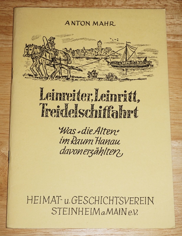 Mahr, Anton F. Th.: Leinreiter, Leinritt, Treidelschiffahrt. Was örtl. Literatur über sie berichtet, zeitgenöss. Maler auf ihren Bildern zeigen, d. „Alten“ im Raum Hanau darüber erzählten ; Vortrag mit Lichtbildern. Steinheim a. Main: Heimat- u. Geschichtsverein, 1987. 21 cm. 36 S. Ill. Geheftet. Leichte Gebrauchsspuren.