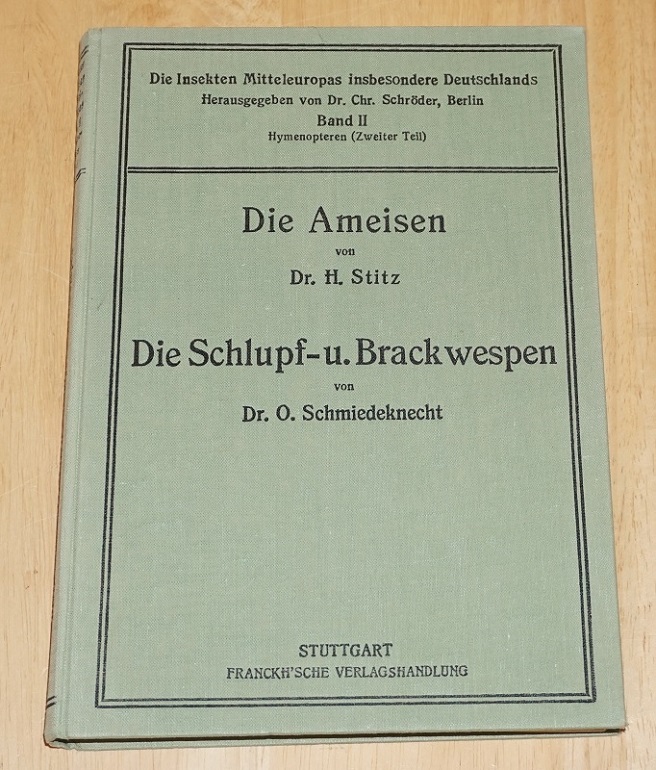 Stitz, Hermann / Dr. O. Schmiedeknecht: Die Ameisen (Formicidae) Mitteleuropas, insbesondere Deutschlands. / Die Schlupf- und Brackwespen. Stuttgart: Franck’sche Verlagsbuchhdl, 1914. 26 cm. VIII, 256 S., 5 Taf. Ill. Ln. Gut erhalten. Kapitale etw. bestoßen, Einband am Rücken etw. ausgeblichen. Die Insekten Mitteleuropas : insbesondere Deutschlands / hrsg. von Christoph Schröder. Bd. II: Hymenopteren: T. 2.