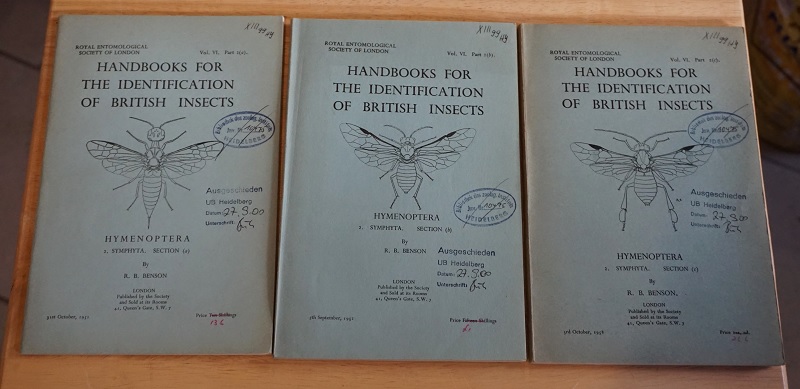 Benson, R.B.: Handbooks for the identification of British insects. Vol. VI, Part 2 (a,b,c). Hymenoptera : Symphyta, section a-c. 3 Bände. London: Royal Entomological Society 1951, 1952, 1958. 22,5 cm, zus. 252 S zahlr. Ill. Geheftet / Kart. Gut erhalten. Ausgeschiedene Bibliotheks-Exemplare mit entsprechenden Kennzeichen auf dem Umschlag. Innen keine Einträge. Handbooks for the identification of British insects.