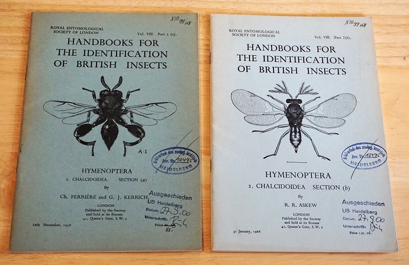 Ferriere, Ch. a. G. J. Kerrich / Askew, R.R.: Handbooks for the identification of British insects. Vol. VIII, Part 2 (a, b). Hymenoptera : Chalcidoidea. 2 Bände. London: Royal Entomological Society 1958, 1968. 22,5 cm, 40 / 39 S zahlr. Ill. Kart. Gut erhalten. Ausgeschiedene Bibliotheks-Exemplare mit entsprechenden Kennzeichen auf dem Umschlag. Innen keine Einträge. Handbooks for the identification of British insects.