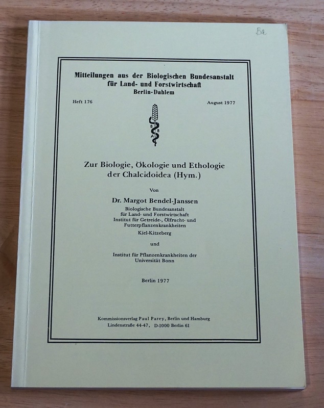 Bendel-Janssen, Margot: Zur Biologie, Ökologie und Ethologie der Chalcidoidea (Hym.). Berlin, Hamburg: Parey [in Komm.], 1977. 24 cm. X, 163 S. Kart. Leichte Gebrauchsspuren. Mitteilungen aus der Biologischen Bundesanstalt für Land- und Forstwirtschaft Berlin-Dahlem, H. 176.