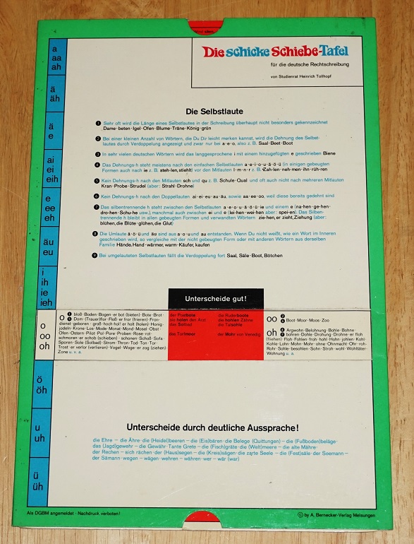 Tollhopf, Heinrich: Die schicke Schiebe-Tafel für die deutsche Rechtschreibung. Melsungen: Bernecker, o.J. 27,5 cm, 1 Taf. Kart. Leichte Gebrauchsspuren. Die schicke Schiebe-Tafel
