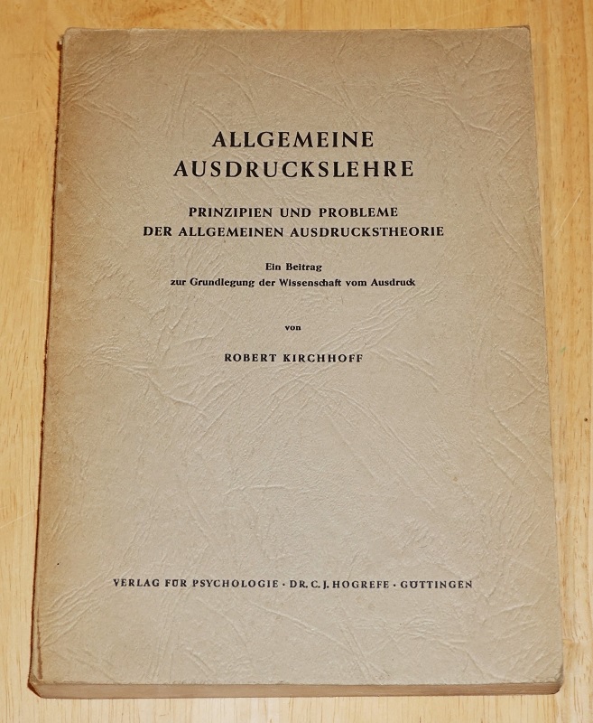 Kirchhoff, Robert: Allgemeine Ausdruckslehre. Prinzipien u. Probleme d. allgemeinen Ausdruckstheorie. Ein Beitrag zur Grundlegung d. Wissenschaft vom Ausdruck. Göttingen: Verl. f. Psychologie Hogrefe, 1957. gr. 8. X, 277 S. Kart. Umschlag an der Rückenkante ca. 2 cm eingerissen, Ecken etw. bestoßen, Schnitt gebräunt / angeschmutzt. Name a. V., sonst innen sauber und gut erhalten.