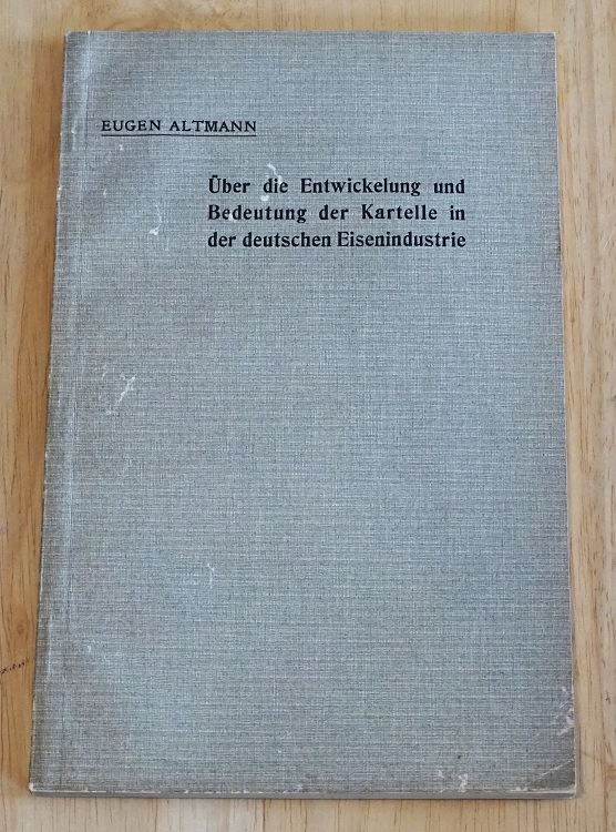 Altmann, Eugen: Über die Entwickelung und Bedeutung der Kartelle in der deutschen Eisenindustrie. Dissertation zur Erlangung der Würde eines Doktor-Ingeneurs von der Grossh. Technischen Hochschule zu Darmstadt. 1909. 8°. 100 S. u. Anl Taf. Kart. Block etw. gewellt, Umschlag berieben. Innen sauber und gut erhalten.