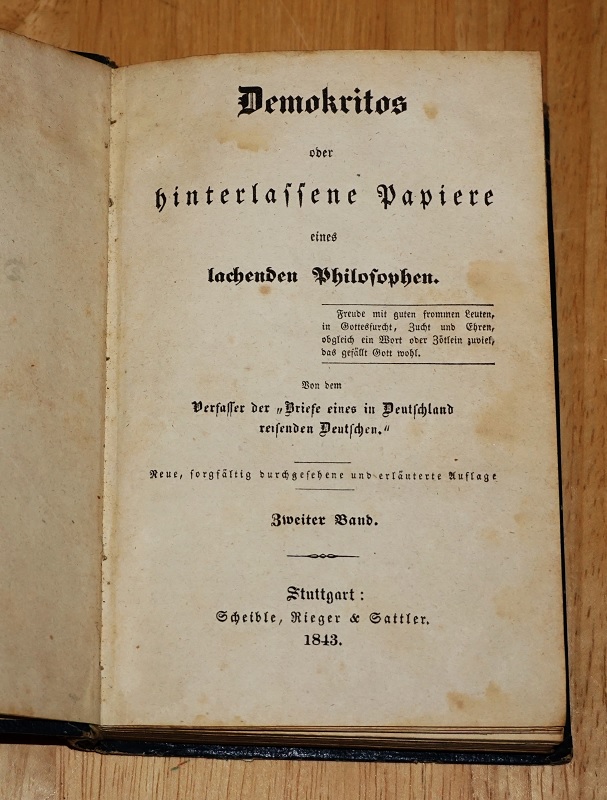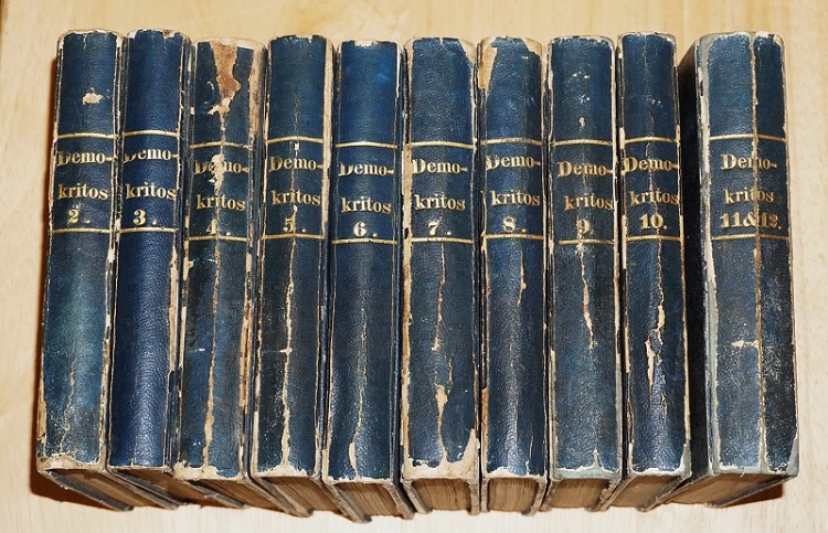 Demokritos oder hinterlassene Papiere eines lachenden Philosophen. Nur Band 2-12, 11 Bände in 10 Bänden (von 12). Von dem Verfasser der“ Briefe eines in Deutschland reisenden Deutschen“. Neue, sorgfältig durchgesehene u. erläuterte Aufl. 10 Bände. Stuttgart: Scheible, Rieger und Sattler 1843 15 cm, Ppd. Deutliche Gebrauchsspuren. Einbände berieben / bestoßen / am Rücken beschädigt. Schnitte und innen gebräunt / braunfleckig. Z.T. einzelne S. locker. Name a. V. , Seitenecken mit Knickspur.