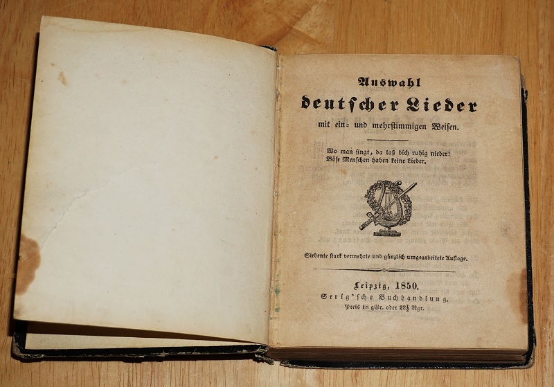 Auswahl deutscher Lieder. Mit ein- und mehrstimmigen Weisen. 7., stark verm. und gänzlich umgearb. Aufl. Leipzig: Serig, 1850. 13 cm, 648 S. zahlr. Noten. Ppd. Einband mit deutlichen Gebrauchsspuren. Rücken an den Kapitalen bestoßen / etw. beschädigt, Einbandecken bestoßen. Schnitt gebräunt / braunfleckig, z.t. auch innen. Bindung fest. Leeres Vorsatzblatt mit Einriß, einzelne Seitenecken mit Knickspur (Eselsohr).