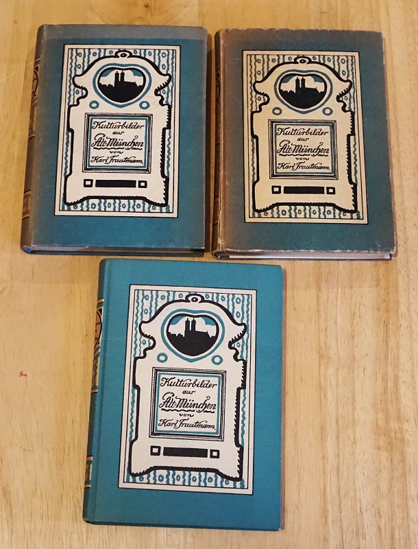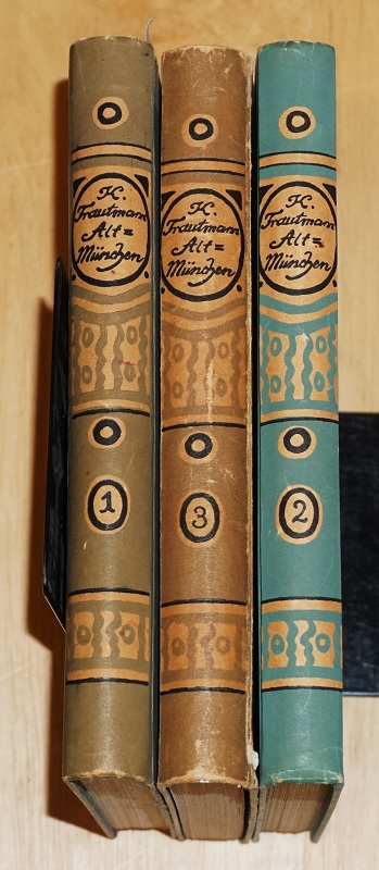 Trautmann, Karl: Kulturbilder aus Alt-München 1 – 3 Reihe. 3.-5.Tsd. / 2 x 1. Aufl. 3 Bände. München: J. Lindauersche Universitätsbuchhandlung 1915-1919. 18,5 cm, 208 / 160 / 195 S. mit Ill. Ppd. Deutliche Gebtrauchsspuren. Einbände z.T. Lichtrandig / gebräunt, beim 3. Teil Rücken angeplatzt. Schnitte gebräunt. Innen sauber und gut erhalten.