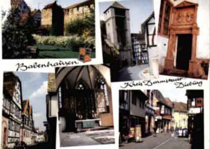 Babenhausen Kreis Darmstadt-Dieburg. Stadtmauer und Breschturm / Hexenturm / Portal am gräflichen Schloß / Amtsgasse mit Adelshöfen / gotischer Altarschrein in der evangelischen Stadtkirche / Fußgängerzone „Bummelgass“. Langstadt: Postkartenverlag Diehl 15 x 10,5 cm, Neuware