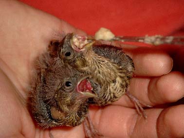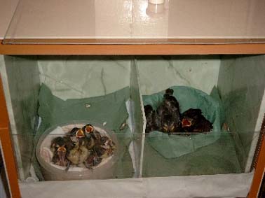 Junge Girlitze, die von Kindern als "lebendiges Spielzeug" mißbraucht worden waren, erhalten Futter. (Bild: Pirmin Ehrhardt) |
