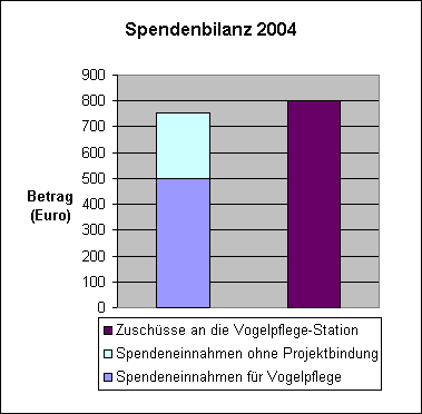 Im Jahr 2004 erhielt das Förderwerk Natur Spenden in Höhe von 753,72 . Für die Förderung von Naturschutzprojekten wurden vom Förderwerk Natur 800,07 ausgegeben. Der Mehrbetrag gegenüber den Spendeneinnahmen stammt aus Erlösen von Verkäufen und den Mitgliedsbeiträgen. Materialien, die das Förderwerk Natur e.V. für eigene Projekte (beispielsweise Materialien für die Informationsarbeit) benötigt, werden hier nicht eingerechnet. In der nachfolgenden graphischen Übersicht ist die Verteilung der Fördergelder von 2004 nach Projekten dargestellt. |