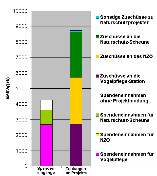 Im Jahr 2006 erhielt das Förderwerk Natur Spenden in Höhe von 4.255,82 . Für die Förderung von Naturschutzprojekten wurden vom Förderwerk Natur 8.777,87 ausgegeben. Damit konnte sich der Umfang der Förderungen gegenüber dem Vorjahr mehr als verdoppeln. Der Mehrbetrag gegenüber den Spendeneinnahmen stammt aus Erlösen von Verkäufen und den Mitgliedsbeiträgen. In der untenstehenden graphischen Übersicht ist die Verteilung der Fördergelder von 2006 nach Projekten dargestellt: |