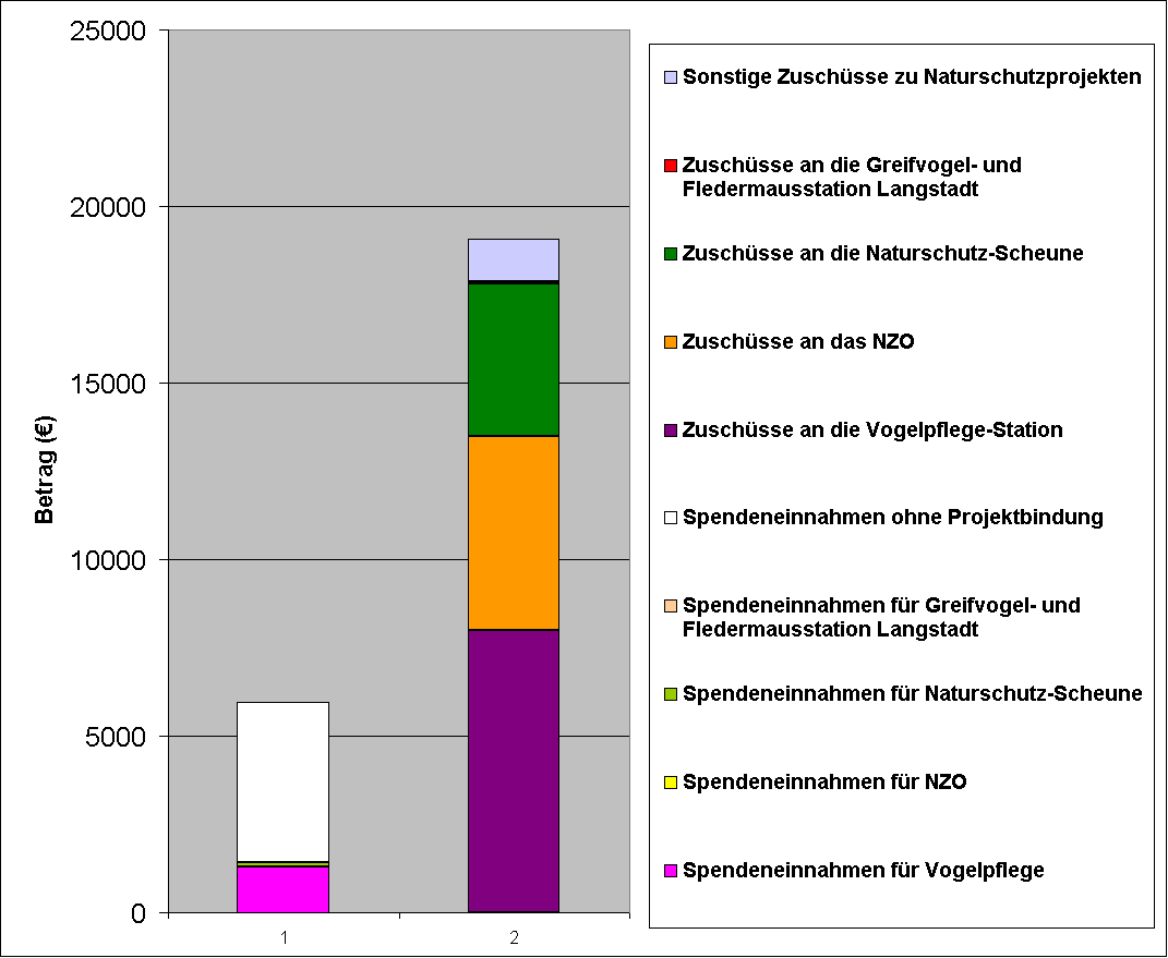 Im Jahr 2011 erhielt das Förderwerk Natur Spenden in Höhe von 5954,38 . Für die Förderung von Naturschutzprojekten wurden 18.865,25 ausgegeben. Damit liegt der Umfang der Förderungen gegenüber dem Vorjahr um gut 1.000,00 höher. Der Mehrbetrag gegenüber den Spendeneinnahmen stammt aus Erlösen von Verkäufen und den Mitgliedsbeiträgen. In der untenstehenden Übersicht ist die Verteilung der Fördergelder von 2011 auf die Projekte graphisch dargestellt: |