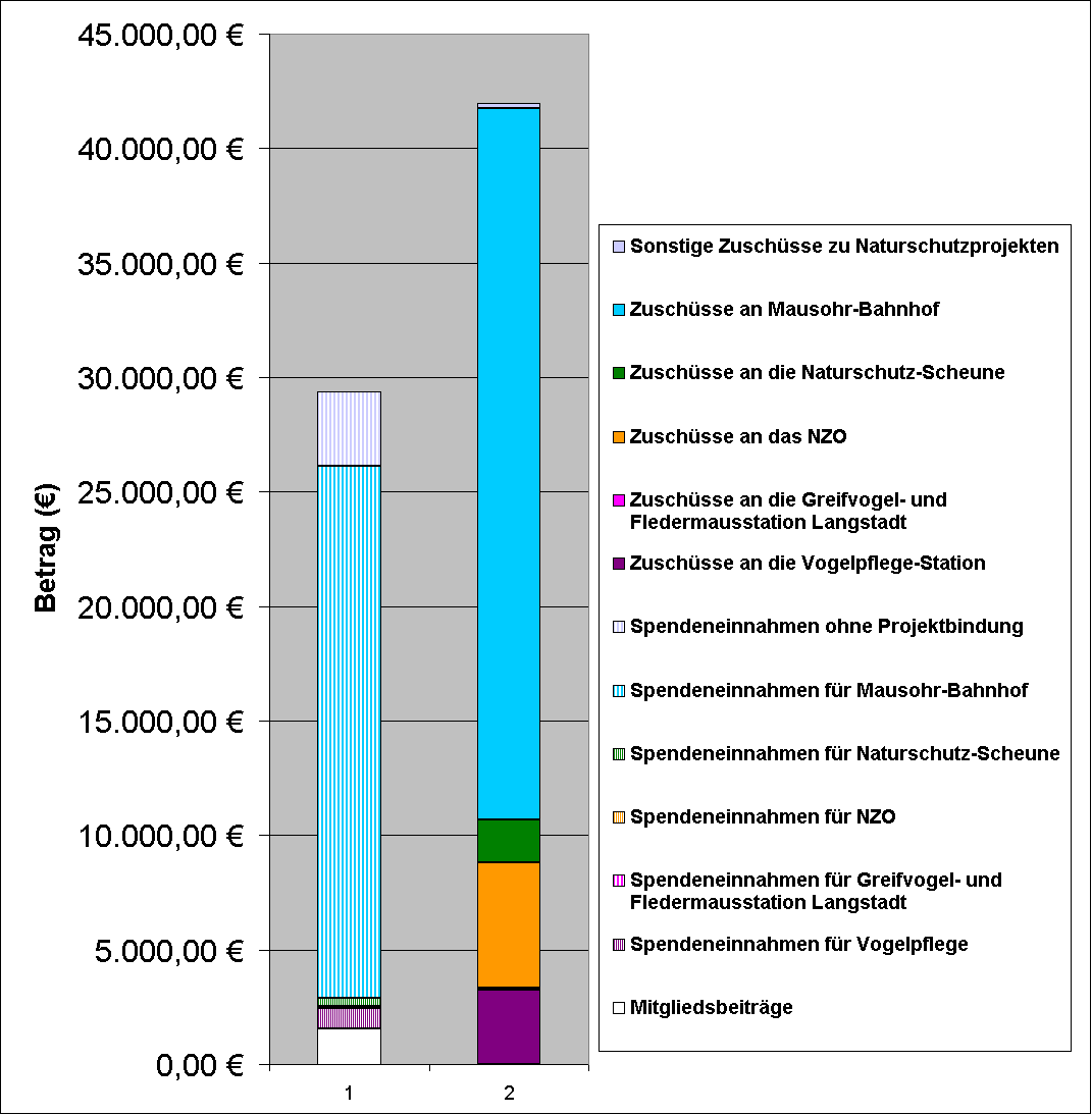 Im Jahr 2013 erreichte das Spendenaufkommen einen neuen Rekordstand von 24.580.00 . Die ausgeschüttete Fördersumme konnte dank der Verkaufsaktivitäten auf 41.964,21 gebracht werden. Dies ist vor allem der hohen Resonanz auf das Projekt "Mausohr-Bahnhof Mümling-Grumbach" zuzuschreiben. Da der Bahnhof nun ein eigenes Konto besitzt, werden die Spendeneinnahmen und Fördersummen beim Förderwerk wieder sinken. In der untenstehenden Übersicht ist die Verteilung der Fördergelder von 2013 auf die Projekte graphisch dargestellt. Da der Mitgliedsbeitrag als steuerlich abzugsfähige Spende zu werten ist und die Höhe von unseren Mitgliedern selbst festgelegt wird, sind die Beiträge in der Säule der Spenden eingefügt. Der Mehrbetrag gegenüber den Spendeneinnahmen stammt aus den Erlösen von Antiquariat und anderen Verkaufsaktivitäten. |