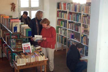 Aufbau der Bücher im 1. Stock des Korporals-Hauses. Im Hintergrund Stapel der bereits ausgepackten Bananenkisten. |