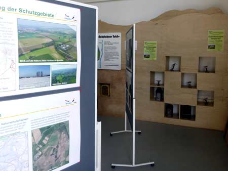 Das älteste Naturschutzgebiet im Altkreis Dieburg, das "NSG Reinheimer Teich" wurde 40 und das wurde mit einer Ausstellung in der Naturschutzscheune gewürdigt. Bei der feierlichen Eröffnung am 1. Mai war auch das Förderwerk Natur präsent. Mit der Gestaltung der Nischenwand zur Ausstellung mit vom Förderwerk bzw. durch Spendenpaten gestifteten Modellen wurde die Ausstellung ergänzt. Natürlich fehlte am Ausstellungs-Eröffnungstag auch der Stand des Förderwerk Natur nicht. |