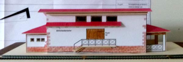 Ein Modell der Güterhalle nach den Planungen: Geänderte Dächer geben dem Gebäude ein neues Erscheinungsbild, ohne den Charakter eines Bahngebäudes zu zerstören. Die Dachüberstände sind wichtig für den Einbau von Ansiedlungshilfen in die Wände (Bild: Dirk Diehl). Das Gebäude wird außerdem Lagerflächen, die Toilettenanlage und einen Flugraum für Fledermäuse beherbergen. |