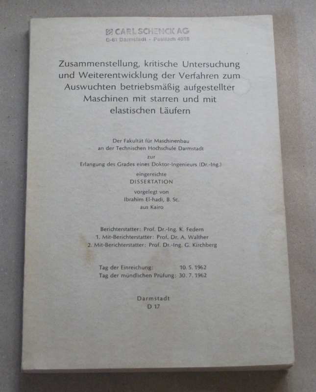 El-Hadi, Ibrahim: Zusammenstellung, kritische Untersuchung und Weiterentwicklung der Verfahren zum Auswuchten betriebsmäßig aufgestellter Maschinen mit starren und mit elastischen Läufern. Dissertation. Darmstadt: Selbstverlag 1962. 21 cm, VIII, 183 S. mit Abb. Broschur. Einband u. Schnitt fleckig u. gebräunt, Stempel auf Umschlag u. letzter Seite, Ecken etw. bestoßen. Sonst gut erhalten.